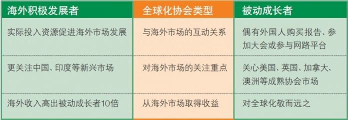 在美国协会经理人协会基金会(ASAE Foundation)针对美国约3,400个全球化发展协会为期5年的调查报告「实现全球增长」(Achieving Global Growth)中,首期330份有效问卷显示,全球化协会分成两种类型:在海外积极发展者和被动成长者。