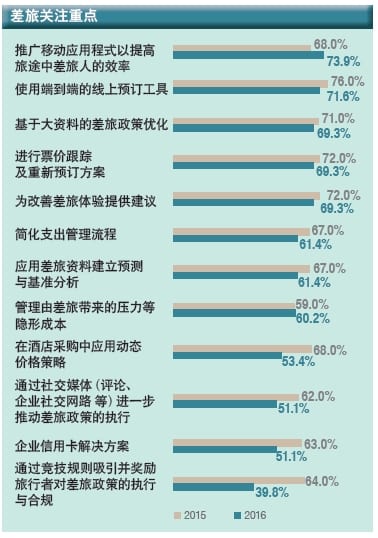 差旅经理在2016年优先考虑事项与上年相比有所变化,「推广移动应用程序以提高差旅人的效率」从2015年的第4位跃居至2016年的第1位。由于智慧手机在差旅行业中的应用得到快速普及,这一变化也就不足为奇。「通过竞技规则吸引并奖励旅行者对差旅政策的执行与合规」则从去年的第9位下滑至第12位,成为今年优先考虑程度最少关注的事项。