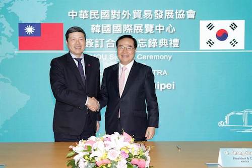 (张广文/ 采访报道)近日,韩国最大国际展览中心KINTEX与台湾外贸协会在台北共同签署合作备忘录MOU,未来台韩会展携手,强化展会互动,提供双方产业交流展出机会。同时,KINTEX也将参加外贸协会2019年「台北国际礼品暨文具展」,并承诺未来在食品展、美容展、娱乐博览会等展项有更多元合作。