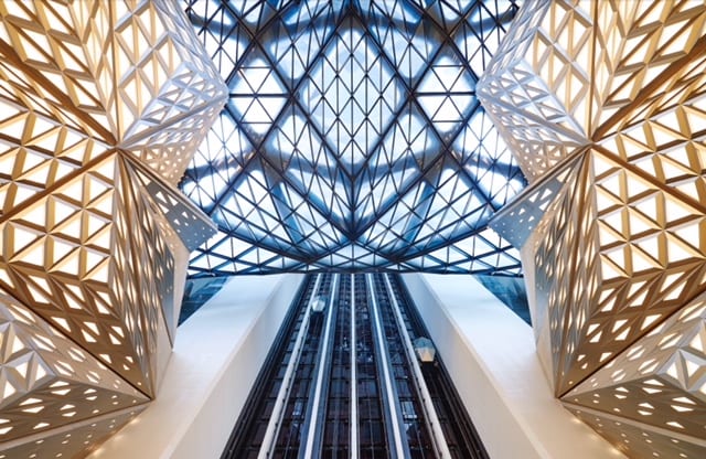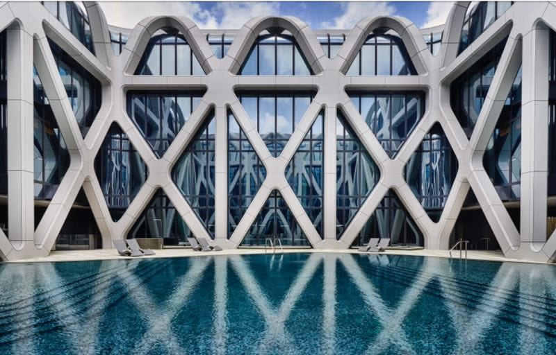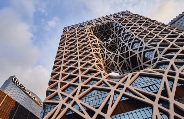 据介绍,摩珀斯酒店以玉饰为设计灵感,突破多项建筑技术,是全球首座自由形态外骨骼结构摩天大楼,由内至外皆展示举世无双的建筑奇观。耗资65亿人民币,采用了28,000吨结构钢,为巴黎铁塔锻铁量的四倍,48,000平方米外墙玻璃足以镶嵌120,000 幅艺术名画《蒙娜莉萨的微笑》,70,500立方米钢筋混凝土 —— 超过28个奥运标准泳池;50,000平方米的网状外骨骼铝制覆盖足以制造超过900万个汽水罐。