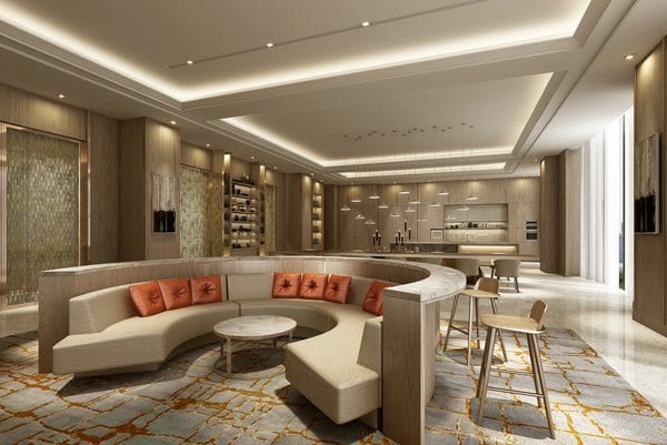 杭州万豪行政公寓二层酒廊效果图,酒廊周末提供鸡尾酒之夜活动,宾客可与亲朋、商业伙伴相聚于此