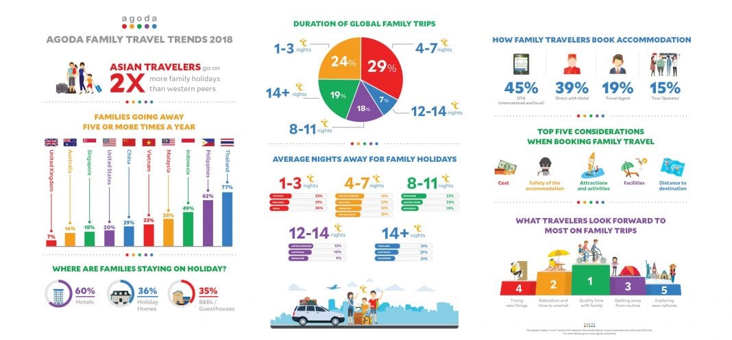 暑假过后,新学期即将到来或已经到来,但这并不意味着家长们正在收起他们的旅行装备。事实上,全球发展最快的在线旅行代理商之一Agoda(安可达)的最新研究显示,全球各地每10组家庭中有7组一年至少进行两次家庭旅行,亚洲家庭比西方家庭的出游频率多出一倍(一年5次旅行对比一年2次旅行)。
