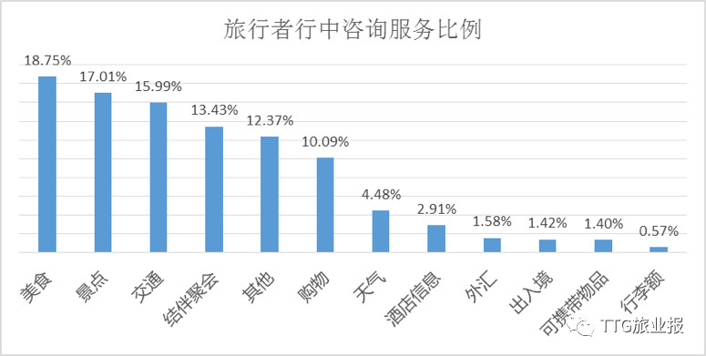 中国游客特别是出境旅游的时候,需要哪些服务?携程“微领队”大数据显示,中国自由行用户咨询求助最集中的问题是:美食18.7%、景点17.0%、交通15.9%、结伴聚会13.4%、购物10.0%。其他热点问题还有:天气4.4%、出入境1.4%、外汇1.5%、行李额0.5%等。购物关注度持续下降。