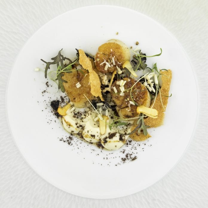烧扇贝佐咖啡黄油和苹果醋,及洋姜及日本蘑菇