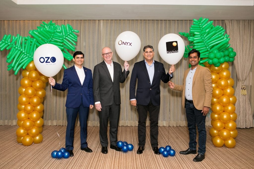 ONYX酒店集团的Kashyop Vora先生和马添乐先生以及Panchshil Realty集团的Ranjit Batra先生和Pawan Rothi先生(从左至右)出席了签约庆祝仪式