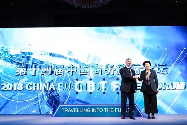 上海市旅游局副局长程梅红女士和美国运通全球商务旅行公司国际市场资深副总裁兼总经理艾利亚斯-穆拉德(Elyes Mrad) 共同开启2018中国商务旅行论坛