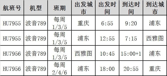 重庆=上海=西雅图航线时刻(以上时刻均为当地时间)