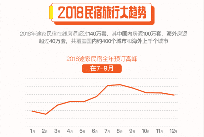 2018年,途家发展迅速,每人每间夜平均花费388元。2018年途家民宿预订高峰期集中在7-9月份。