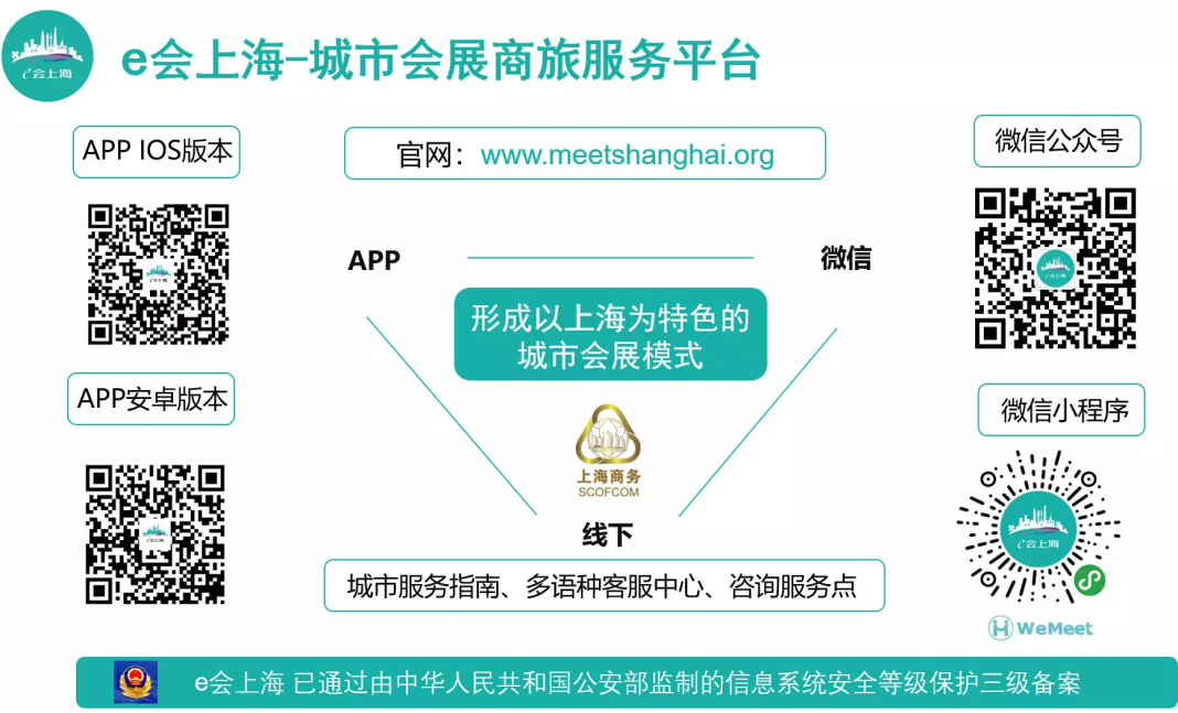 据介绍,为适应不同国家地区和不同人群的商旅服务需求和信息获取习惯,e会上海平台以网站、APP、微信公众平台、城市服务指南、线下咨询服务点和多语种声讯中心等多种形式为载体,提供食住行和娱购游为主的城市商旅咨询服务和导引。