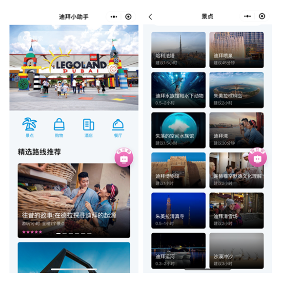 迪拜旅游局与微信早前合作推出的“迪拜城市体验”小程序取得初步成功。近期,双方再度合作,全新升级该小程序为“游迪拜小助手”,通过搭载GPS导航、AI智能机器人客服等功能,并创新性地推出10个中文语音导览行程,全面涵盖景点、购物、酒店、餐厅四大版块指南,让初来乍到的中国游客能通过微信轻松无忧游览迪拜。