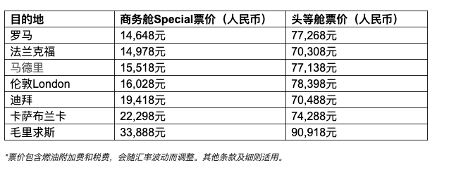 商务舱Special票价特惠自2019年10月15日推出,将持续至10月31日止,部分适用目的地及票价如下,更多目的地,请登录阿联酋航空中文官方网站(www.emirates.cn)查询并预订。欲购买阿联酋航空头等舱机票体验奢华之旅的乘客,也可参看下表了解相关票价信息。