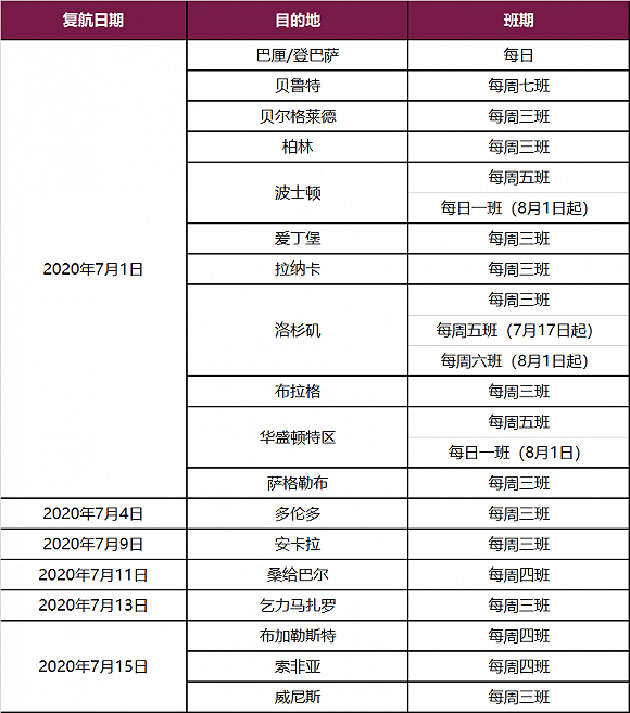卡塔尔航空宣布率先恢复11条国际航线,迎来近期单日复航数量最多的一天,继续领导全球航空业的复苏。卡塔尔航空预计在七月中旬将航线网络拓展到65个目的地,每周执行超过430架次航班。