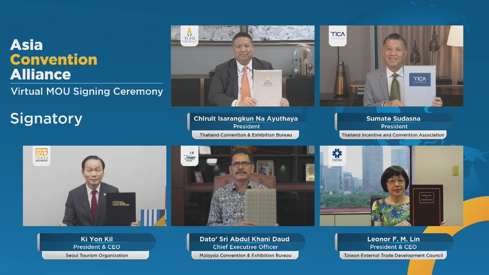 (张广文/ 采访报道)近日,亚洲会议联盟(Asia Convention Alliance,简称ACA) 通过虚拟签署谅解备忘录,正式宣布成立。该会议联盟是一个旨在宣传会议活动行业和驱动会议与商务活动选择到亚洲举办的全新联盟,其五个创始成员包括:泰国会议展览局(TCEB)、泰国奖励旅游和会议协会(TICA)、韩国首尔旅游发展局(STO)、台湾对外贸易发展委员会(TAITRA)和马来西亚会议与展览局(MyCEB)。