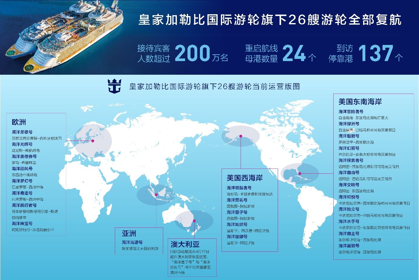 自2020年12月旗下首艘复航游轮 “海洋量子号” (Quantum of the Seas)在新加坡恢复运营至今,皇家加勒比游轮已在全球24个母港重启航线,到访了137个停靠港,接待超过200万名宾客,宾客满意度创新高。