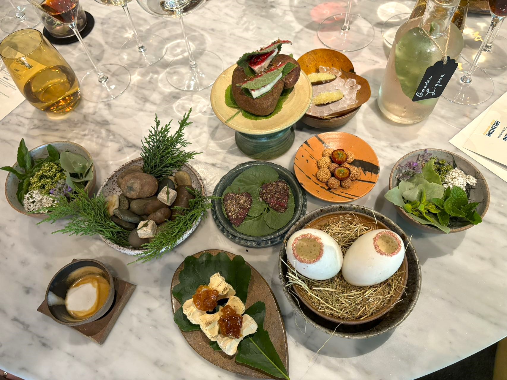 最奇特的菜式像是被埋在一堆烤过的树叶中,要用手挖出来吃的鲜嫩龙虾肉、在石头上需被舔食品尝的缤纷酱料、灌进鸭蛋壳中并须从洞口吸食的香草甜汤、要挤压尤加利树之红花淋上汁再吃的烧烤和牛、外表像是巧克力糖的舞菇等。餐厅在上菜时,还会提供专属吃法和品尝顺序的建议,让同桌的人可以一边互动,一边在有趣的氛围下,逐一品味,感受一道道结合新鲜、绿色、美味的健康美味。